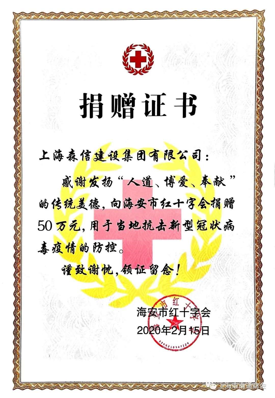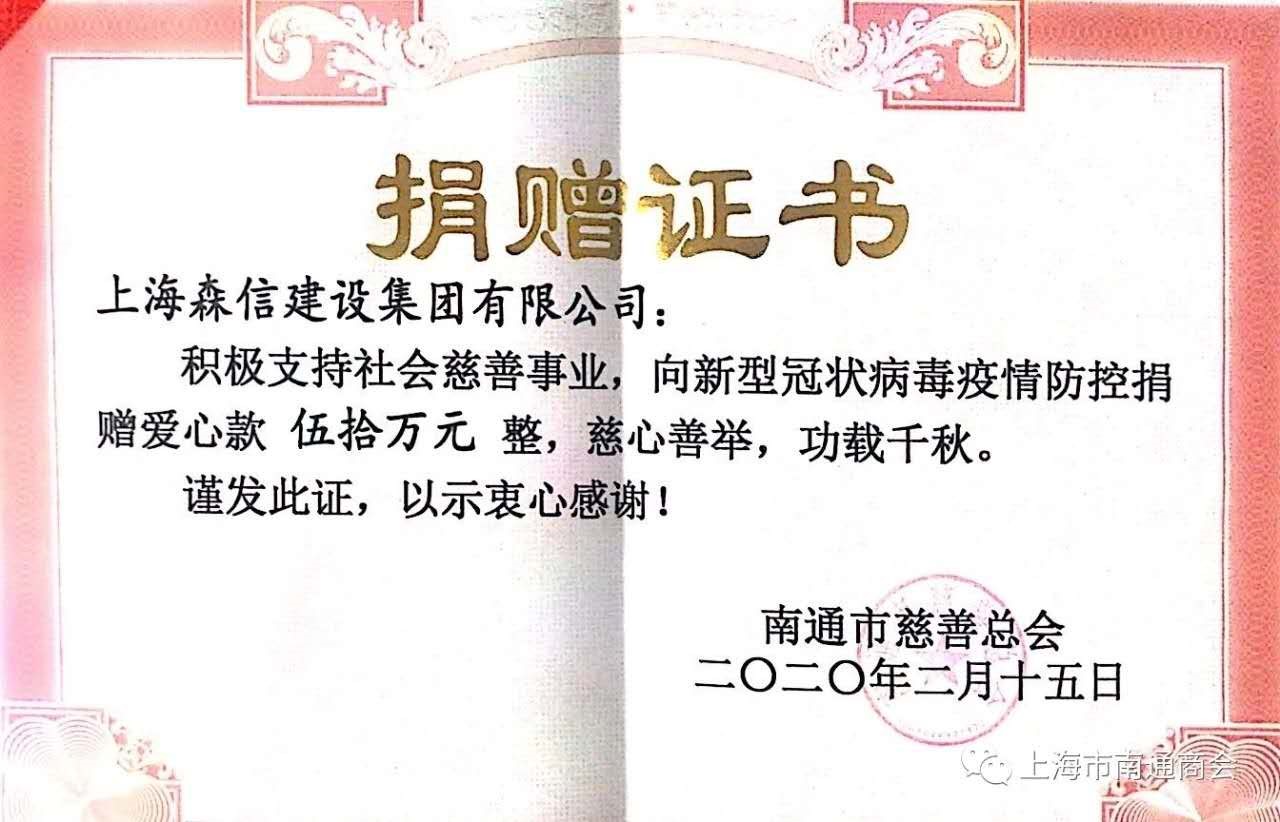 虹口區(qū)工商聯(lián)(總商會)主席(會長)、森信投資控股(集團)有限公司董事長、上海市南通商會會長王文其通過虹口區(qū)光彩事業(yè)促進會、上海覺群文教資金會、南通市慈善總會、南通市海安市紅十字會捐款200多萬元,為武漢及武漢周邊疫情嚴重地區(qū)提供防護、消毒及生活物資;并向上海市青少年發(fā)展基金會捐款1萬元。他表示,森信將密切關注疫情的變化,以實際行動落實社會責任,帶動各行各業(yè)眾志成城、同舟共濟,全力抓好疫情防控,有序推進復工復產(chǎn)。